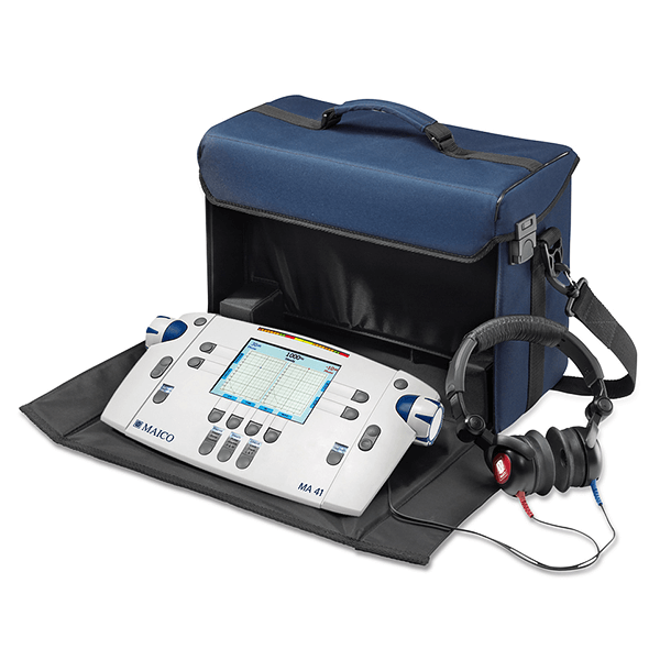 Медицинский прибор MAICO MA 41 представляет собой современный аудиометр, обеспечивающий воздушное проведение звука (сила – 10-100 дБ, частоты – 125-8000 Гц) и костное проведение звука (сила – 10-70 дБ, частоты – 250-6000 Гц).